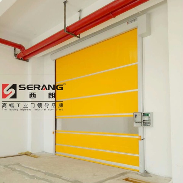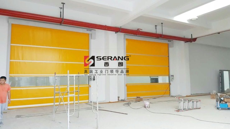 苏州西朗门业生产的工业快速卷帘门安装于江苏盐城工厂车间内,警示颜色门帘美观大方牢固耐用: