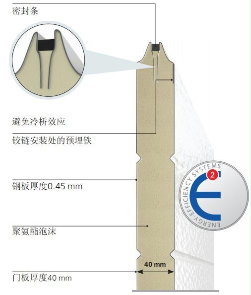 聚氨酯高分子材料填充,保温性好。门板间、侧部、底部和顶部密封条有效阻止了空气和雨水的渗漏,以及门板的非接触性设计有效防止了温度的内外传递,低耗能,低碳。