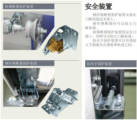 高强度镀锌五金件连接,扭簧镀锌处理,扭簧轴应力处理,强度高、可靠、耐用。特殊设计的铰链安装位置下面的预埋钢板,加固了铰链和门板的连接。滚轮支架镀锌和耐磨尼龙滚轮,长效持久,维护简单。