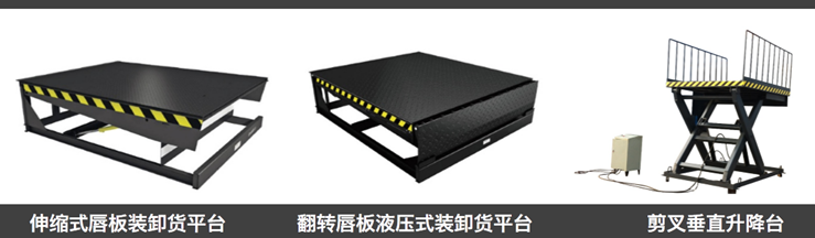 伸缩式装卸货平台、翻转唇板式登车桥、剪叉式垂直升降台如下图: