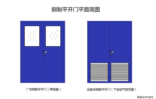 下图为:带视窗的钢制平开门与带百叶窗的平开门示意图: